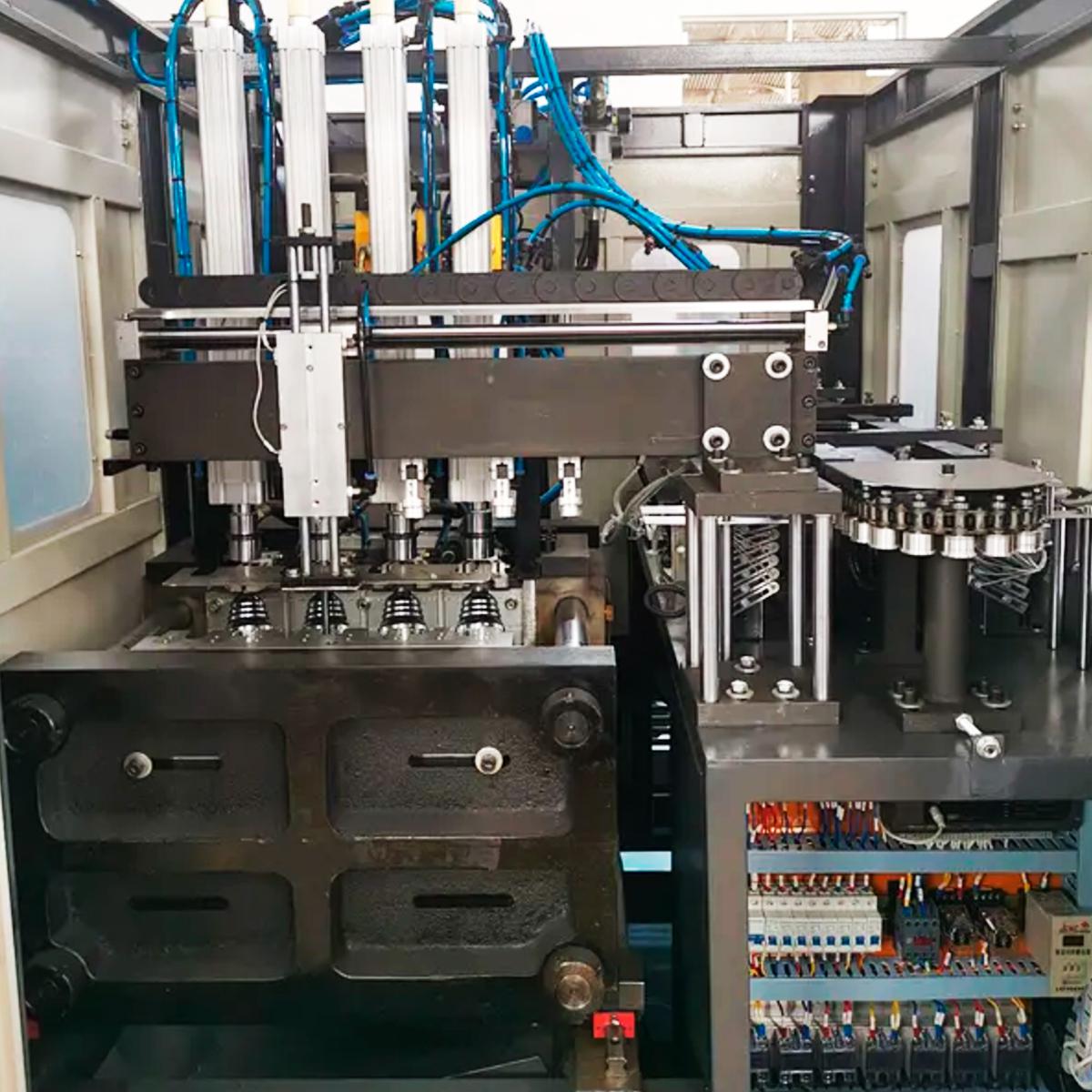 A máquina é certificada pela CE e utiliza peças de alta qualidade, como válvulas de alta pressão da marca Parker, cilindros rotativos da marca Airtac, solenoides LP da marca FESTO e um PLC da marca BOTHFIT. A máquina tem dimensões de 193x92x220cm e um peso de 1500kg, com uma capacidade de produção de 2000-2500 garrafas por hora, e é capaz de produzir garrafas de PET de 0,1L a 1,5L em quatro cavidades. A máquina requer uma voltagem de 3P 380V/220V e tem uma potência de 15kW.